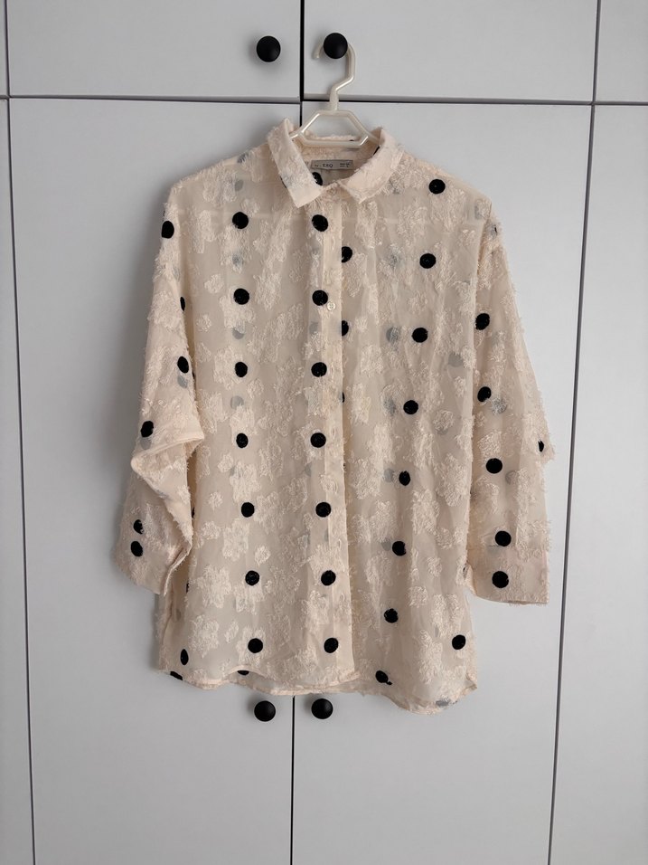 Siyah puantiyeli bej keten gömlek, düğmeli ve uzun kollu. Bohem tarzıyla günlük kullanıma uygundur.