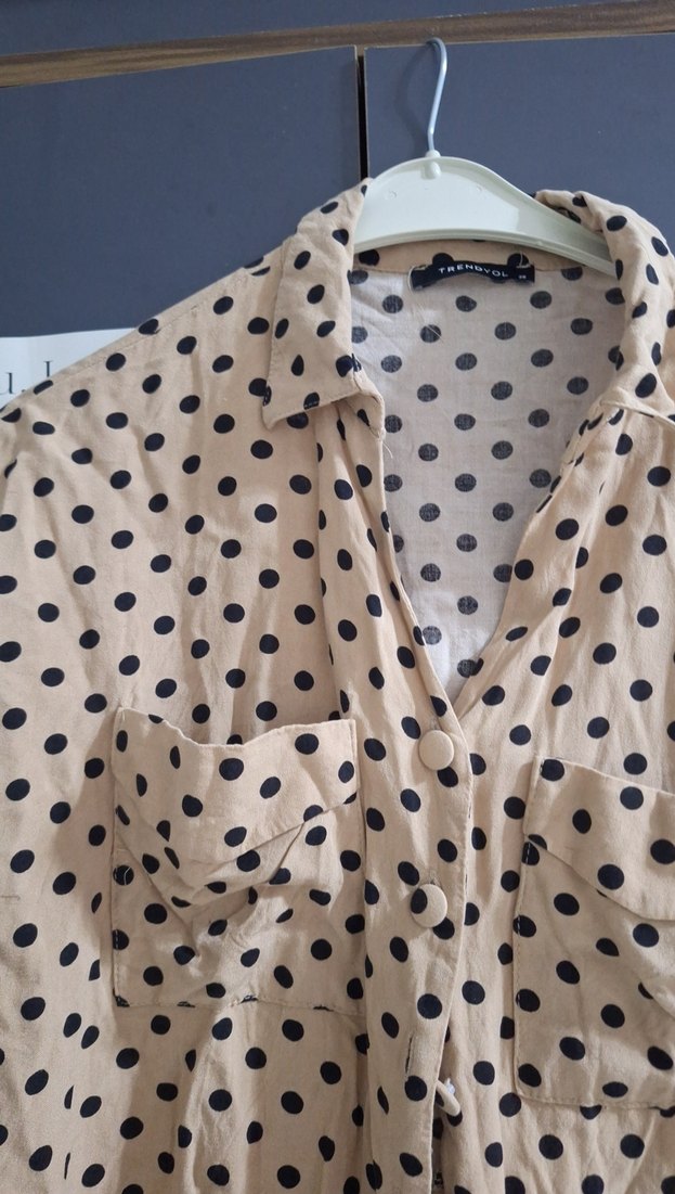Bej renkli, siyah puantiyeli keten gömlek. V yakalı, düğmeli ve kısa kolludur. Rahat, bol kesimi günlük sokak stiline uygundur.