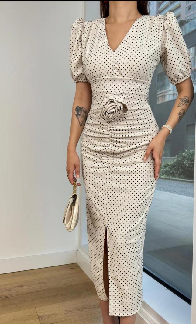 V yakalı, kemerli ve çiçek detaylı bu bej puantiyeli uzun elbise, ince kesimi ve ince askılı kollarıyla klasik Paris tarzını yansıtıyor. önündeki gül detayı beğenmedim icin çıkarttım
