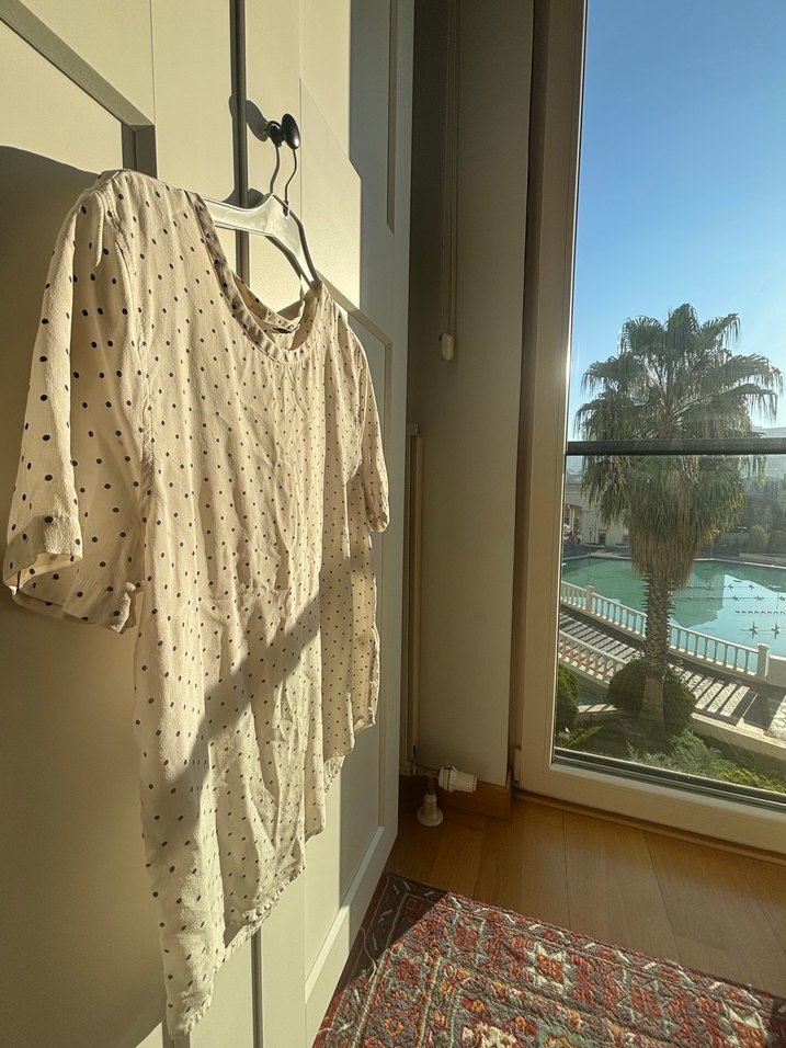 V yakalı, kısa kollu, bol kesim bej renkli keten bluz. Drapeli tasarımı ve puantiyeli deseniyle günlük kullanıma uygun.