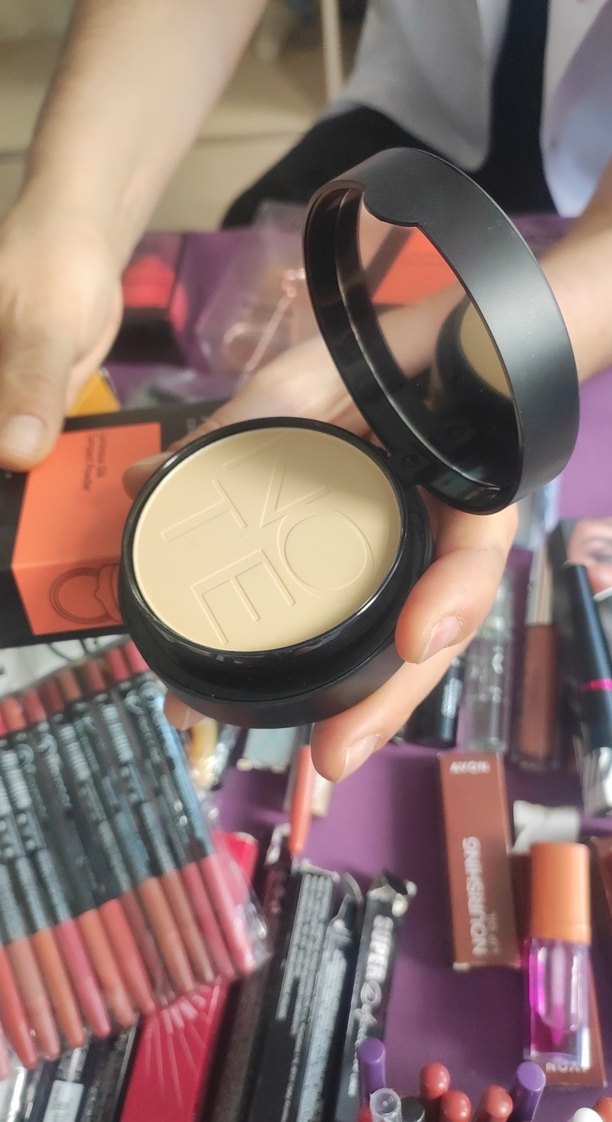 Açık ton bej kompakt pudra, mat siyah kutuda ve aynalı, pürüzsüz kapatma sağlar.