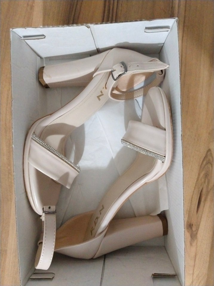 pudra renkli, tokalı kayışlı blok topuklu kadın ayakkabısı, klasik ve minimalist tarzda.