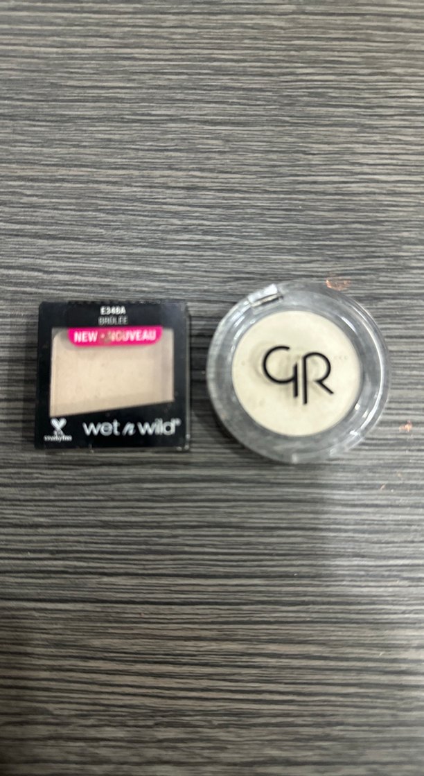 Bej renkli, gri tonlu Wet n Wild ve GR marka kompakt pudra ürünleri. Makyaj için uygun ambalajda sunulmuştur.