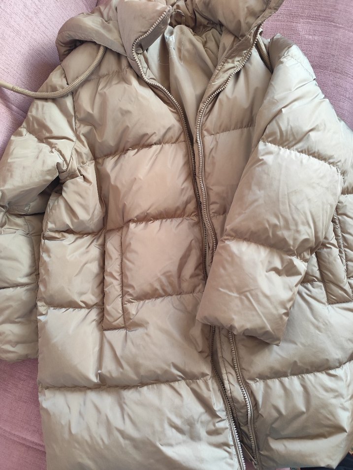 Bej renkli, kapüşonlu şişme zara mont .S beden ama M bedenede olur kalıbı geniş .yırtık kısmı bulunmamaktadır sadece alt kısmında küçük bir leke mevcut aynı tonda olduğu için belli olmuyor. montu giyen kişinin kilosu 55 boyu 165