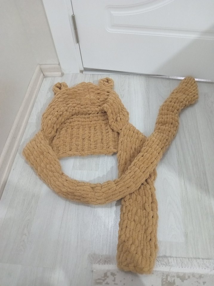 Yumuşak dokulu, örgü bej balaclava üzerinde küçük kulak detaylarıyla sade, bohem tarzda.