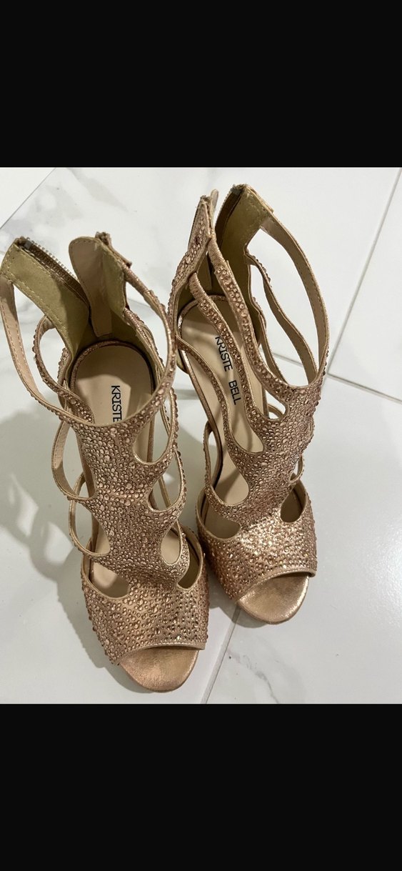 Bej süet platform topuklu ayakkabılar, parlak yılan desenli ve pul işlemeli detaylara sahip, düğün ve özel anlar için uygun.