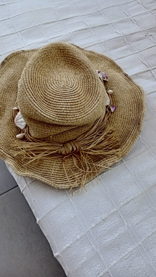 Hafif bej renkli, örgü dokulu kadın şapka, bohem tarzda püskül ve deniz kabuğu detaylarıyla retro bir görünüm sunar.