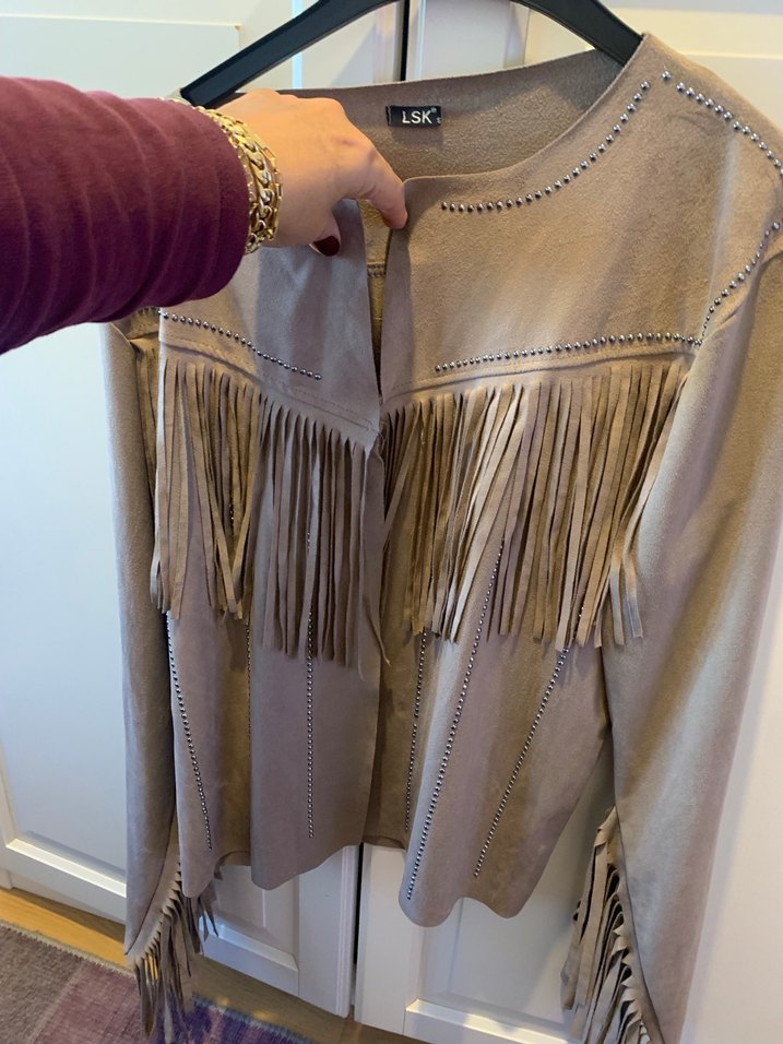 Bej renkli süet kumaştan, uzun kollu ve yaka detaylı kadın ceket. Salaş kesim, nakış ve püskül detaylarıyla bohem tarz sunar. Marka: LSK.