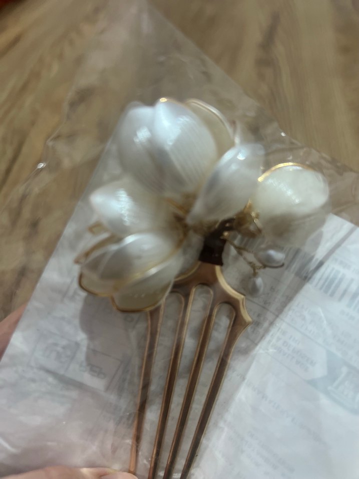 Bej renkte, püsküllü ve vintage tarzda plastikten yapılmış konvansiyonel saç aksesuarı.