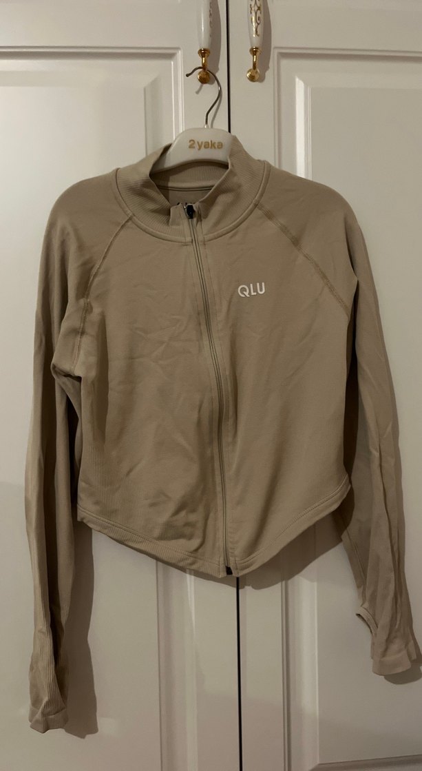 Bej renk, yumuşak ve sıcak kumaştan yapılmış, yüksek yakalı ve fermuarlı, dar kesim kadın ceket. Uzun kollu ve normal boydadır, günlük sokak stili için uygundur. Göğüs kısmında QLU logosu bulunur.