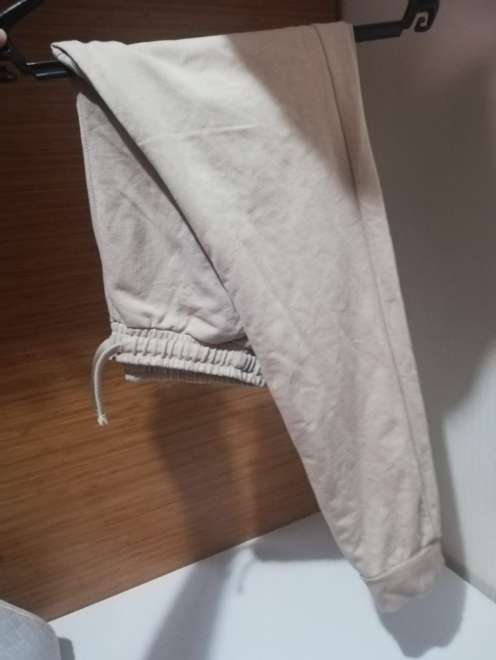 Yumuşak keten kumaştan yapılmış, rahat kesim bej eşofman. Midi boy ve desensiz, konforlu ve şık bir görünüm sunar.