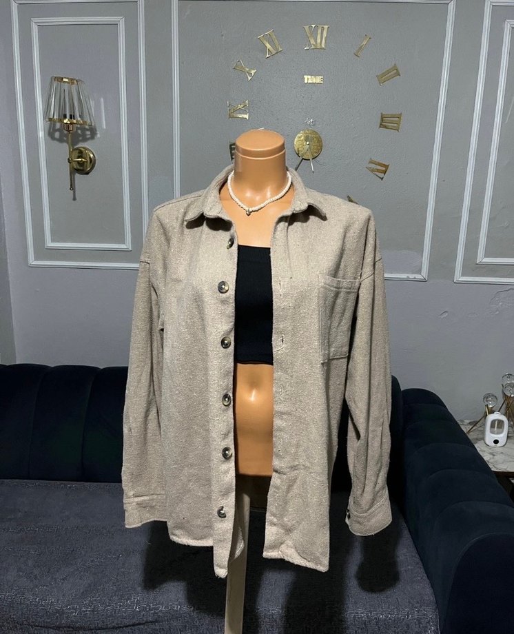 Bej renkli, keten kumaştan yapılmış, rahat kesim ve düğmeli, uzun kollu kadın gömleği. Günlük kullanım için uygun, sokak modasına uygun tarzda.