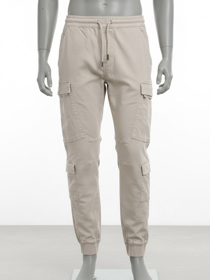 Rahat kesim, bej renkli erkek kargo pantolon. Orta boy, sentetik yumuşak kumaş ve elastik bel lastiği ile günlük kullanıma uygun çok cepli tasarım.(örjinal markadır)
