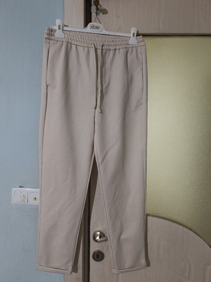 Bej renkte, rahat kesim ve midi boyda erkek kumaş pantolon. Yumuşak sentetik kumaştan üretilmiş, desensiz ve günlük kullanıma uygun.
