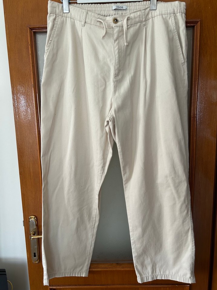 Bej renkte, keten kumaştan, rahat kesim pantolon. Günlük kullanıma uygun, zahmetsiz şıklık sunar.