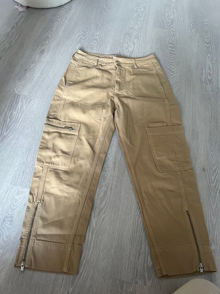 Bej renk, rahat kesim, fermuarlı cepler ve paça fermuarları bulunan erkek kot pantolon. Günlük kullanım için uygundur.