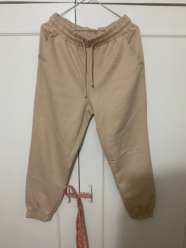 Pastel bej renkli, kadın eşofman. lastikli bel ve paça detaylarıyla günlük rahat kullanım için uygun. M bedendir.sadece 2 kez giyildi.