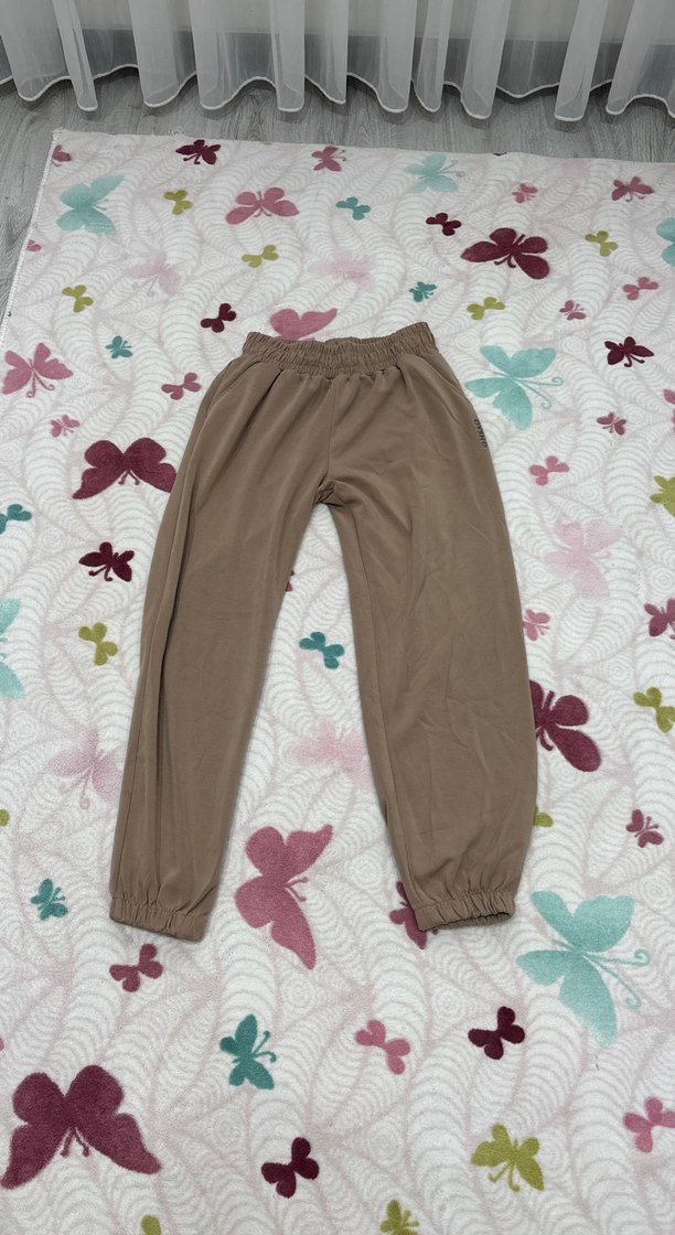 Yumuşak sentetik kumaştan, elastik bel ve paçalarla bej renkli, rahat kesim kadın eşofman altı. Günlük kullanım için uygun, trend sokak tarzı için ideal.