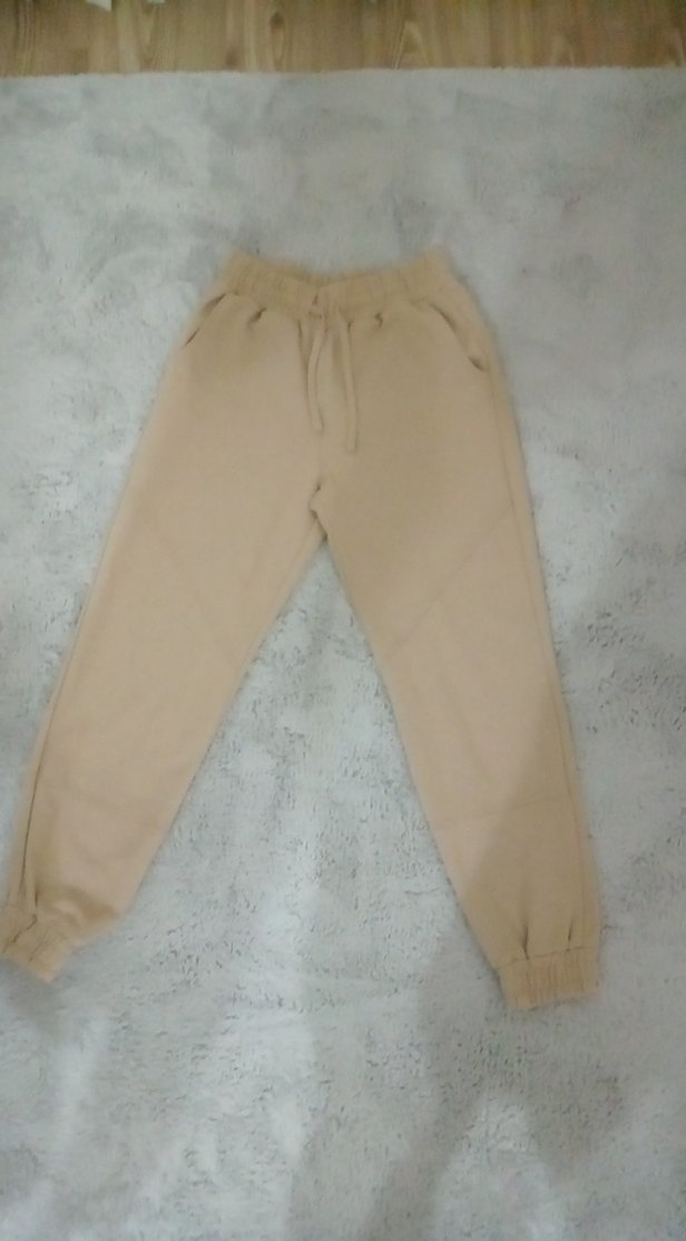 Yumuşak ve sıcak kumaştan, bej renkli, rahat kesim kadın eşofman altı. Lastikli bel ve paçalarla konforlu, pastel tonlarda günlük ve şık tarzda.