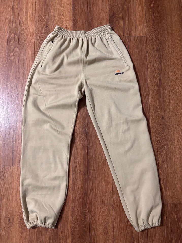 Bej renk, rahat kesim kadın eşofman altı, yumuşak ve sıcak kumaştan, dış mekanlar için uygun rahat şıklık sunar. ️