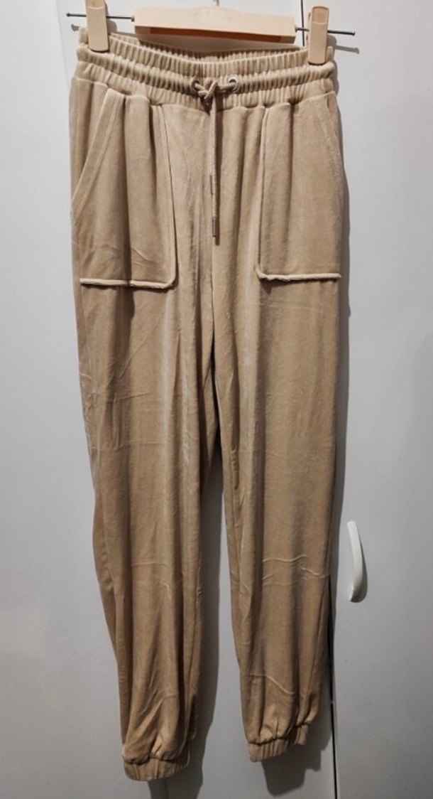 Bej renk, rahat kesim ve kadife kumaştan uzun boy kadın eşofman, gündelik kullanıma uygun konforlu ve şık bir sokak stili sunar. Yıkandı ve hiç kullanılmadı Yeni