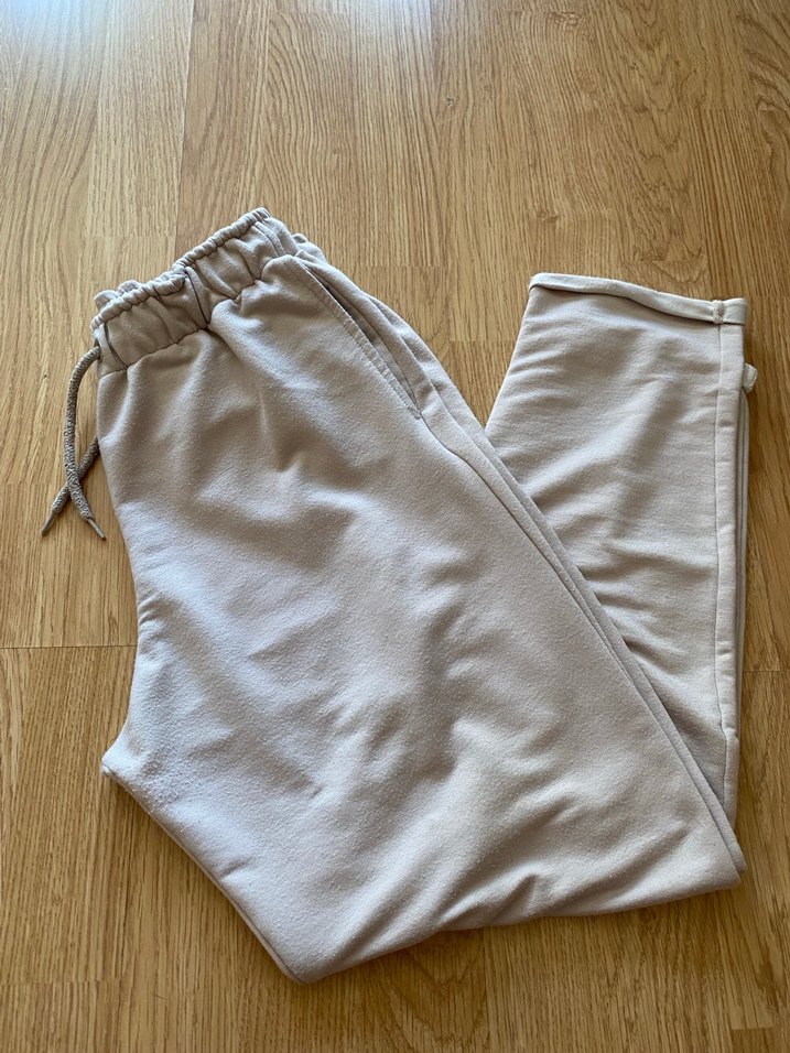 Yumuşak keten kumaştan, bej renkli, rahat kesim kadın eşofman altı. Konfor için bağcıklı lastikli bel detayına sahip. Günlük kullanıma uygun. ♀️