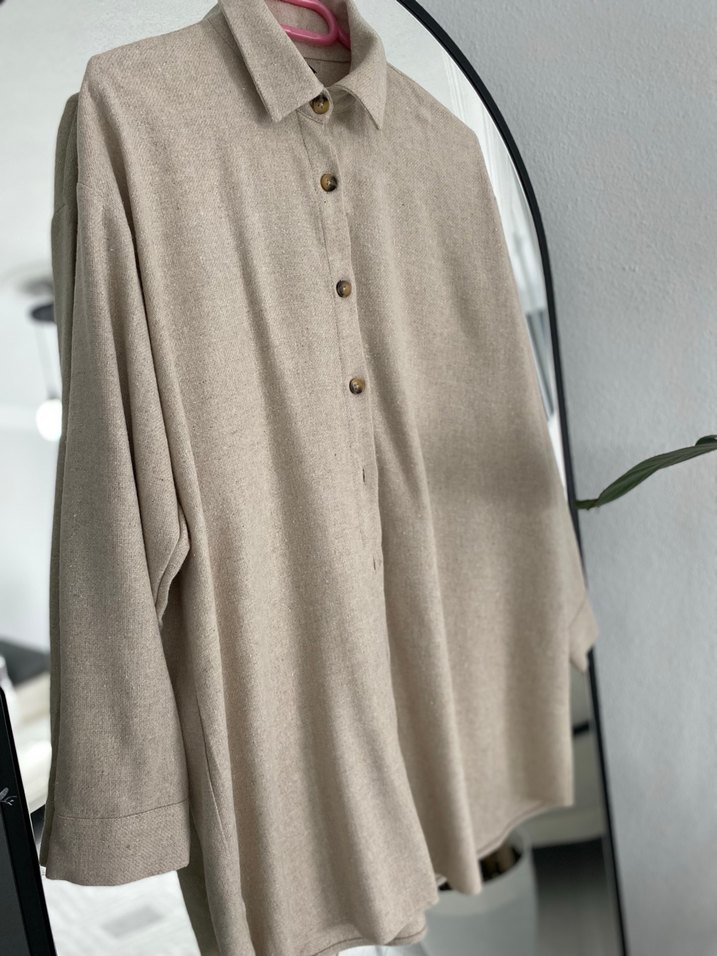 Bej renk, keten kumaştan, düğmeli ve uzun kollu, rahat kesim kadın gömleği. Notlu yaka detayıyla günlük kullanıma uygun.
