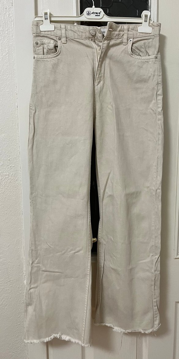 Bej keten kumaştan, bol kesim ve midi boyda, günlük kullanıma uygun sade ve rahat kadın pantolonu.