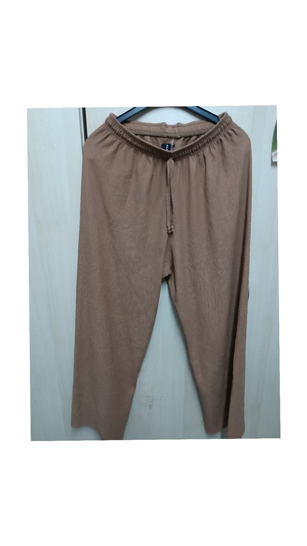 Bej renkli keten kumaştan, rahat kesim ve pile detaylı, uzun boy kadın pantolonu, elastik bel ile konforlu.