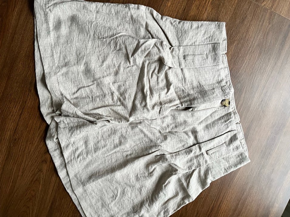 Bej renkli, keten kumaştan, rahat kesim ve drapeli kadın şort. desensiz ve günlük kullanım için uygun, minimalist bohem tarzında.
