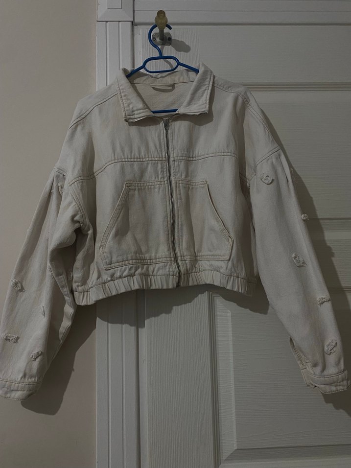 Uzun kollu, bej renk, düğmeli ön kapamalı ve kısa kesim bol rahat bir denim ceket. Günlük kullanıma uygundur.