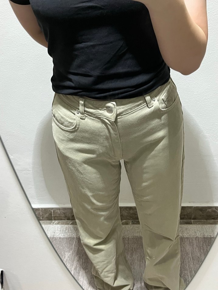 Bej haki karışımı bir rengi var,üzerinde bir leke yok ,kusurları fotoğraflarda var,paça kısmının modeli öyle birazda giymekten yıpranmış