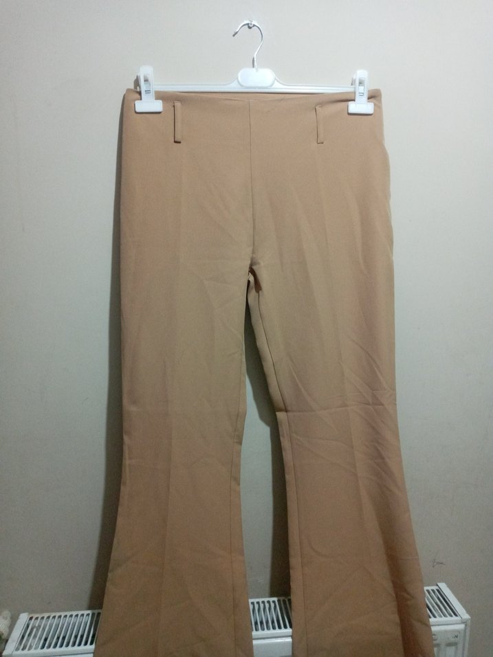 Bej renk, rahat kesim ve midi boyda kadın kumaş pantolon. Sentetik kumaştan olup, minimalist ve desensiz tasarımı ofis ve sokak stiline uygundur.