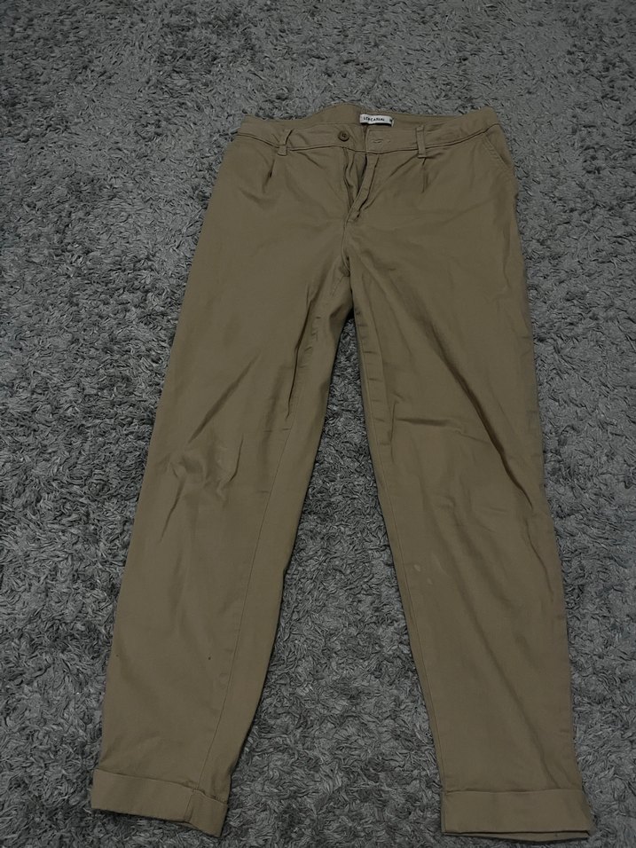Bej renkte, rahat kesim ve normal midi boyda kadın kumaş pantolon. Yumuşak sentetik kumaştan, gündelik kullanıma uygun, desen içermeyen sade tasarım.