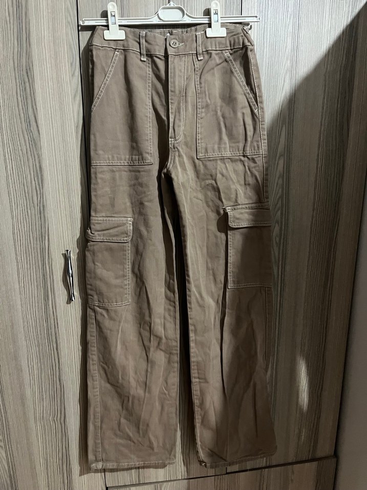 Bej renkli kumaştan, rahat kesim kadın pantolon. Günlük kullanıma uygun