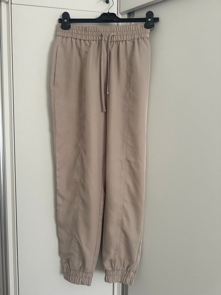 Bej renkli, ince sentetik kumaştan, rahat kesim ve lastikli bel ile bileklerde toparlanan kadın pantolonu. Günlük kullanım için uygundur.