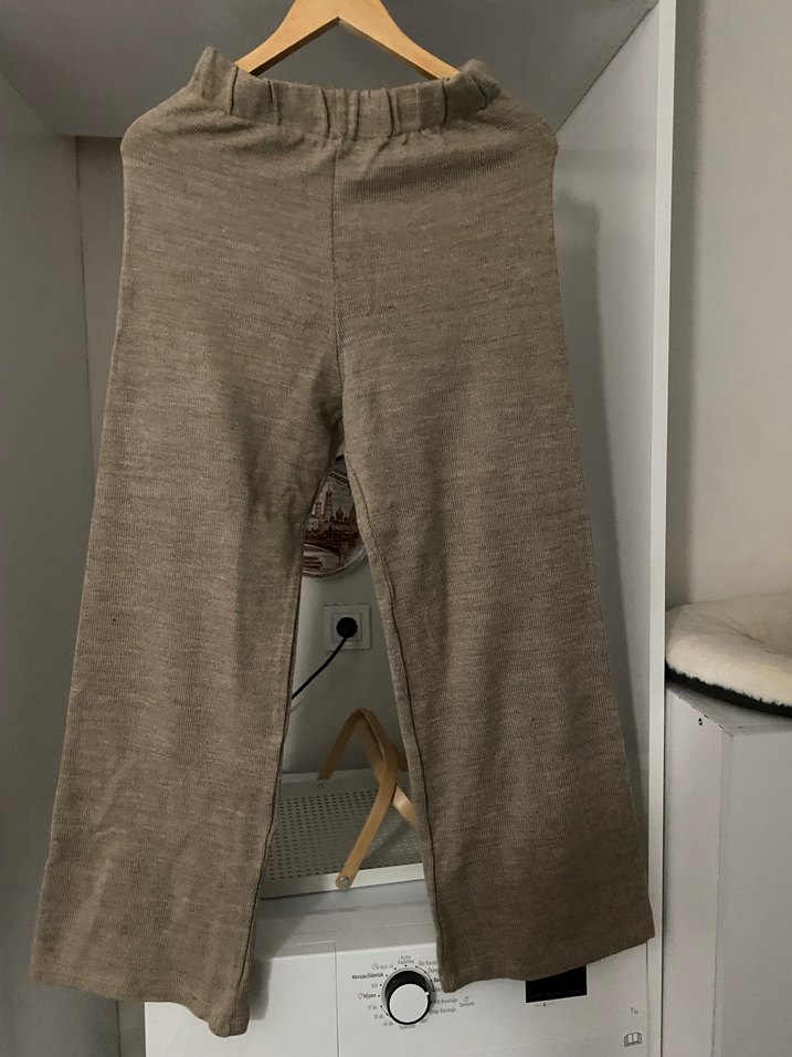 Midi boy, rahat kesim ve keten kumaştan yapılmış bej kadın pantolon, günlük rahat kullanıma uygun konforlu ve şık bir parça.