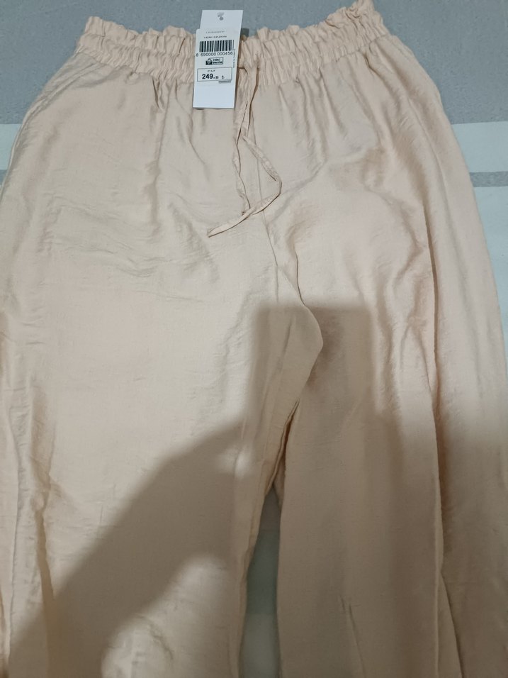 Bej,turuncu ya da Krem renk, rahat kesim keten kumaştan midi uzunlukta, sade ve minimal tasarımlı günlük kullanıma uygun pantolon.