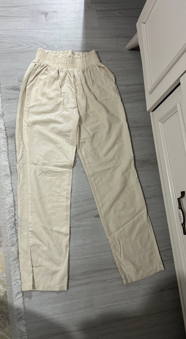 Bej renkli, rahat kesim keten kadın pantolon. Orta boy uzunluğu ve desensiz yapısıyla günlük rahat bir sokak stili sunar. L BEDEN AMA BİRAZ KALIBI DAR!