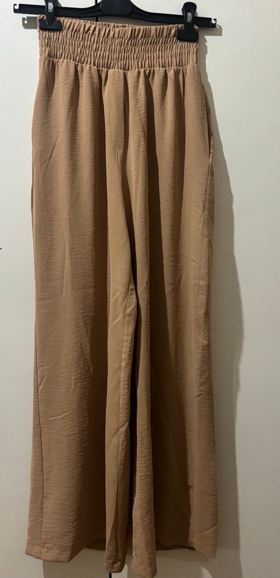 Bej renkte, keten kumaştan, bol kesim ve drapeli uzun kadın pantolonu. Minimalist ve sade tarzda, günlük kullanıma uygundur.