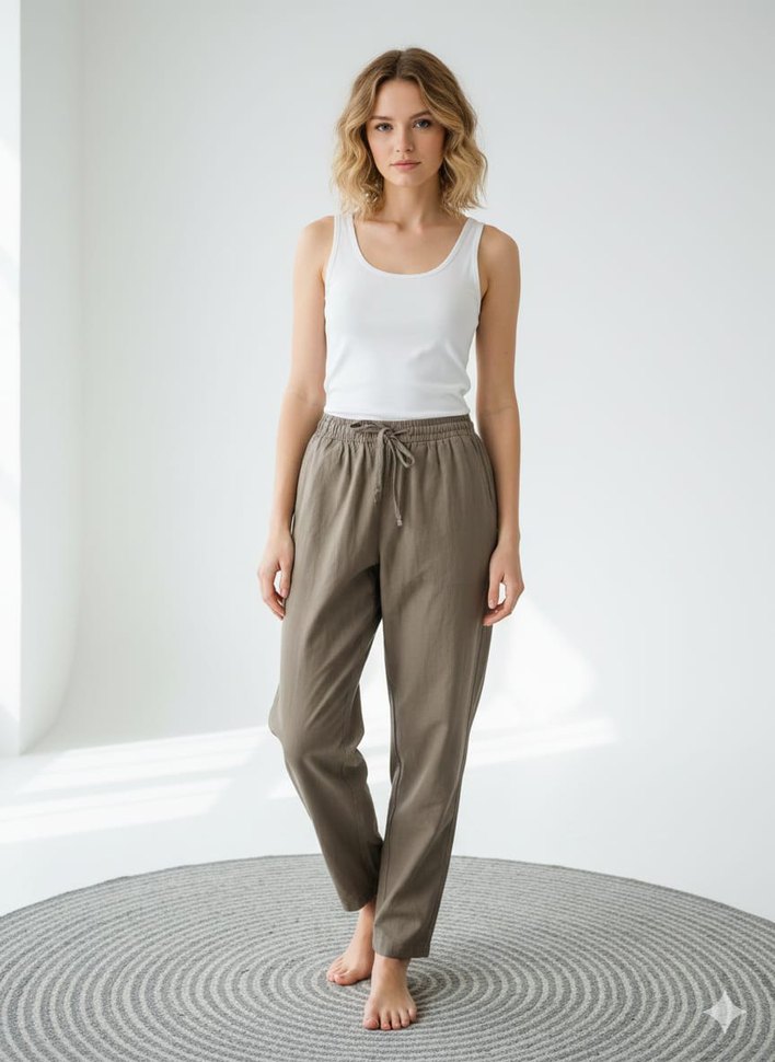 Bej renkte, bağcıklı bel detaylı, desen içermeyen rahat kesim keten kadın pantolonu. Günlük kullanım için uygundur.