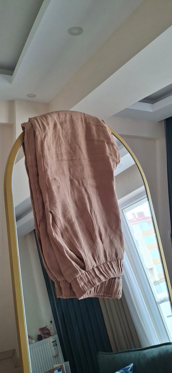 Bej renkli keten kumaştan, bol kesim ve drapeli tasarıma sahip, rahat ve trend günlük kullanım için midi boy pantolon. Desensiz ve sade görünümlü.