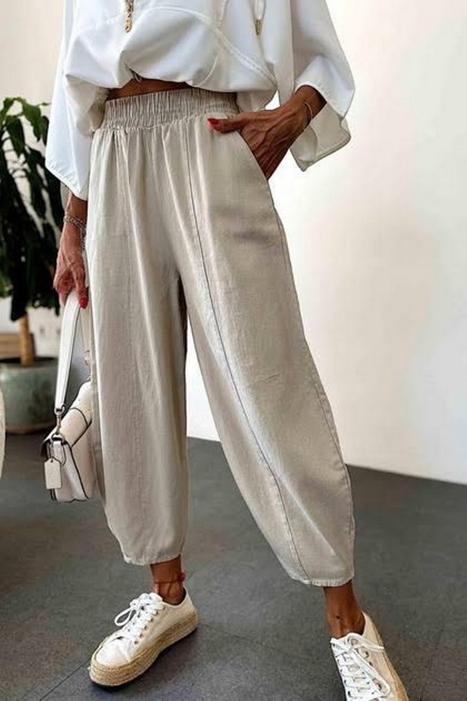 bej keten kumaştan, rahat kesimli ve midi boy elastik bel pantolon. Günlük kullanıma uygun, zahmetsiz şıklık sunar. birkaç kere kullanıldı sorunu yoktur hafif iç gösteriyor uygun iç çamaşırı ile kullanabilirsiniz rahat bir ürün uzunluk 84 bel 32 cm ama lastikli esniyor bu tik ürünüdür
