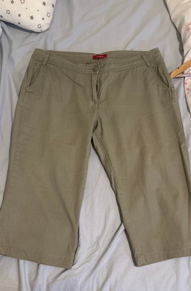 Bej renkli, keten kumaştan rahat kesim kadın kapri. Günlük kullanım için uygun, midi boyda ve desen içermeyen şık bir parça.