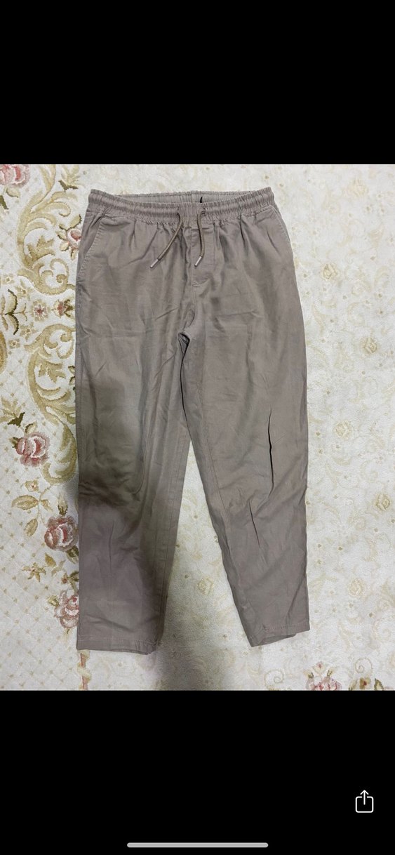 Bej renk, rahat kesim keten pantolon. Orta boy, elastik bel ve desensiz sade tasarımıyla günlük kullanıma uygun.