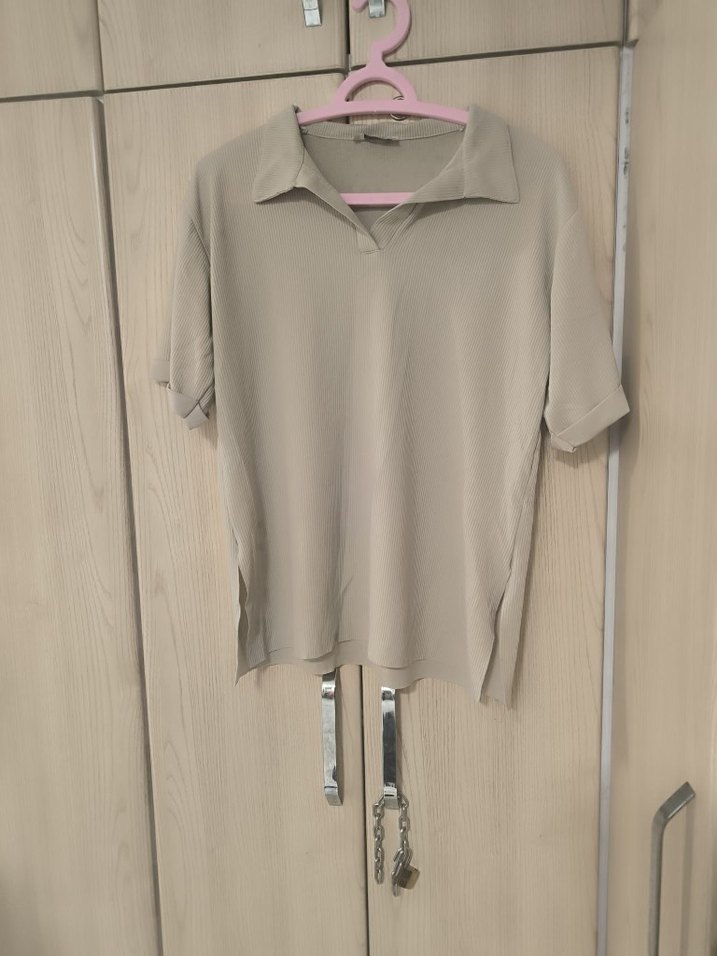 Bej renkli, kısa kollu, yakalı ve rahat kesim kadın gömleği. İpeksi dokusu ve desensiz tasarımıyla günlük rahat sokak stiline uygundur.