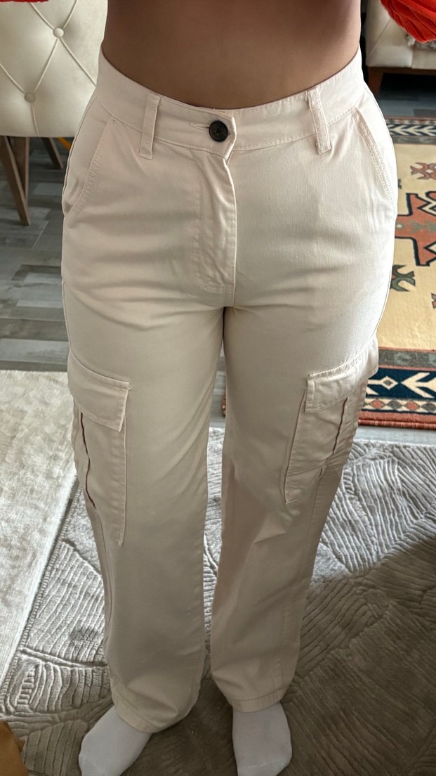 Yumuşak pamuklu kumaştan yapılmış, bej renkli rahat kesim midi kot pantolon, günlük kullanıma uygun şık ve rahat bir sokak stili sunar. ✨