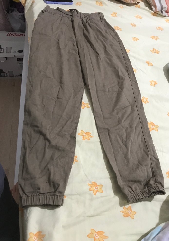Bej renk, keten kumaştan, midi boy, rahat kesim ve lastikli bel detayıyla günlük dış mekan kullanımı için uygun kadın pantolonu.