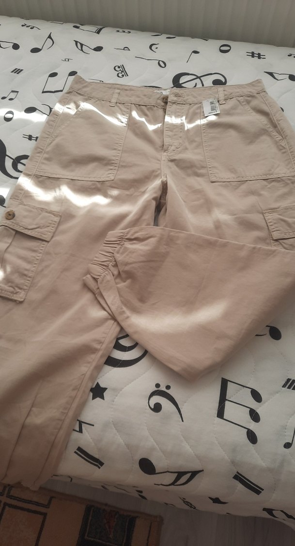 Yumuşak pamuk kumaştan yapılmış bej renkli, rahat kesim midi pantolon. Ön ve yan cepleri ile gündelik kullanıma uygun, rahat ve şık bir sokak stili sunar.