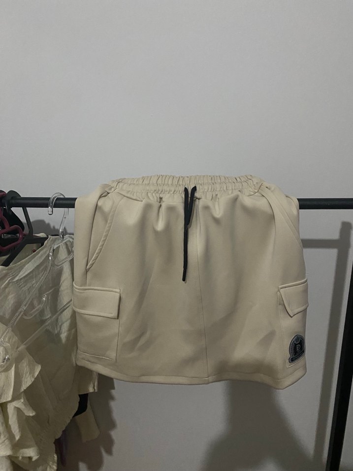 Yan cepleri ve elastik bel bandı bulunan, yumuşak sentetik kumaştan yapılmış bej rahat kesim mini etek.